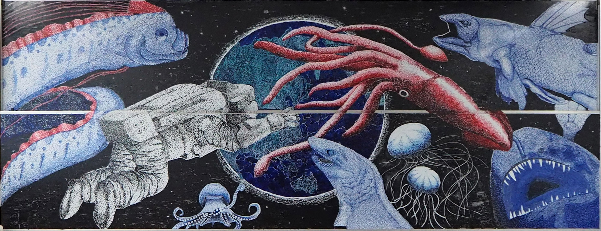 白板に描いているとは思えないほどのクオリティとテーマと世界観に大変感銘を受けました。技術面では特に宇宙飛行士の浮遊感が出ている点が優れており、ひとつひとつの物体描写も丁寧で、圧巻な作品です。