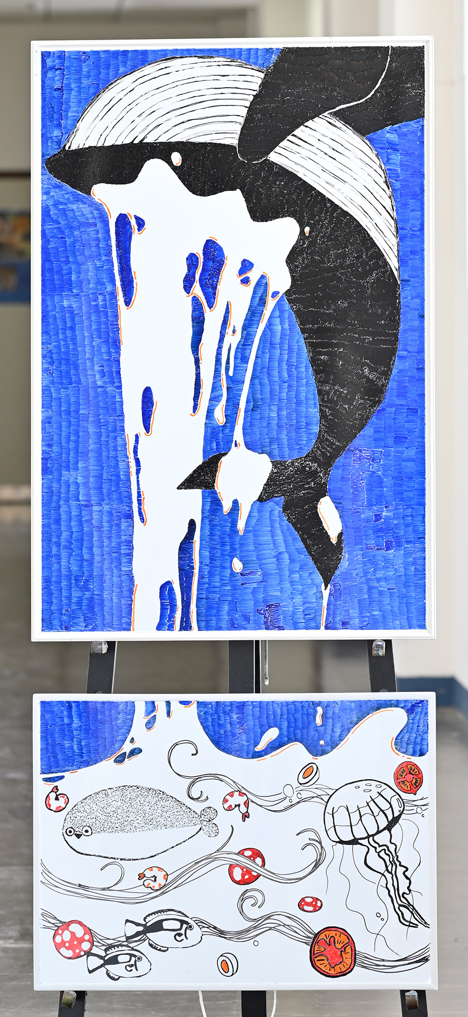 ホワイトボードの白を効果的に生かし、2枚を使って海の広がりをユニークに表現した作品です。上部のクジラは力強く水面から跳ね上がる瞬間をダイナミックに捉え、迫力があります。一方で下部の海中シーンは流れるような線でクラゲや魚がゆったり泳ぐ姿が描かれ、静と動の対比が印象的です。