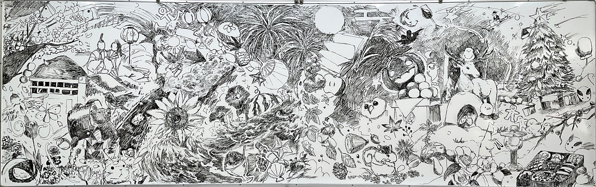 見応えがある作品です。ホワイトボードを春夏秋冬の順に、季節ごとの自然や行事、風物や食べ物などを描き込んでいます。端から季節を追って見ていくのが楽しいです。35人で制作したようですが、一人一人が考えた季節のイメージが描かれているのでしょう。ホワイトボードは線描になるので、色面づくりが難しいですが、線の密度によって黒い色面をつくり、画面の視線誘導をしています。見ているとあらためて日本は豊かな国であることを感じさせられます。